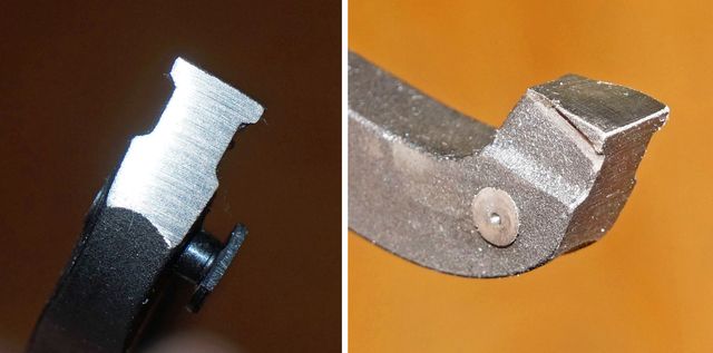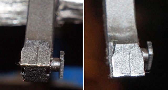Тягу взвода теперь, похоже, изготавливают литьем, наблюдается стык половин формы. Литье не самое аккуратное и пятка тяги взвода имеет кривой торец, а так же верхнюю плоскость.